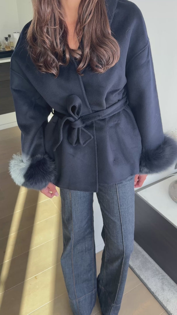 Why wear your heart on your sleeve when you can wear the most luxurious of furs on them! - 100% Wool - Short Coat - Luxury Detachable fox fur cuffs - Detachable Belt - Style your coat in 3 ways depending on your mood with detachable fur cuffs and belt. Please note due to the nature of the fur there is a chance for slight colour differencesSize & Fit Information